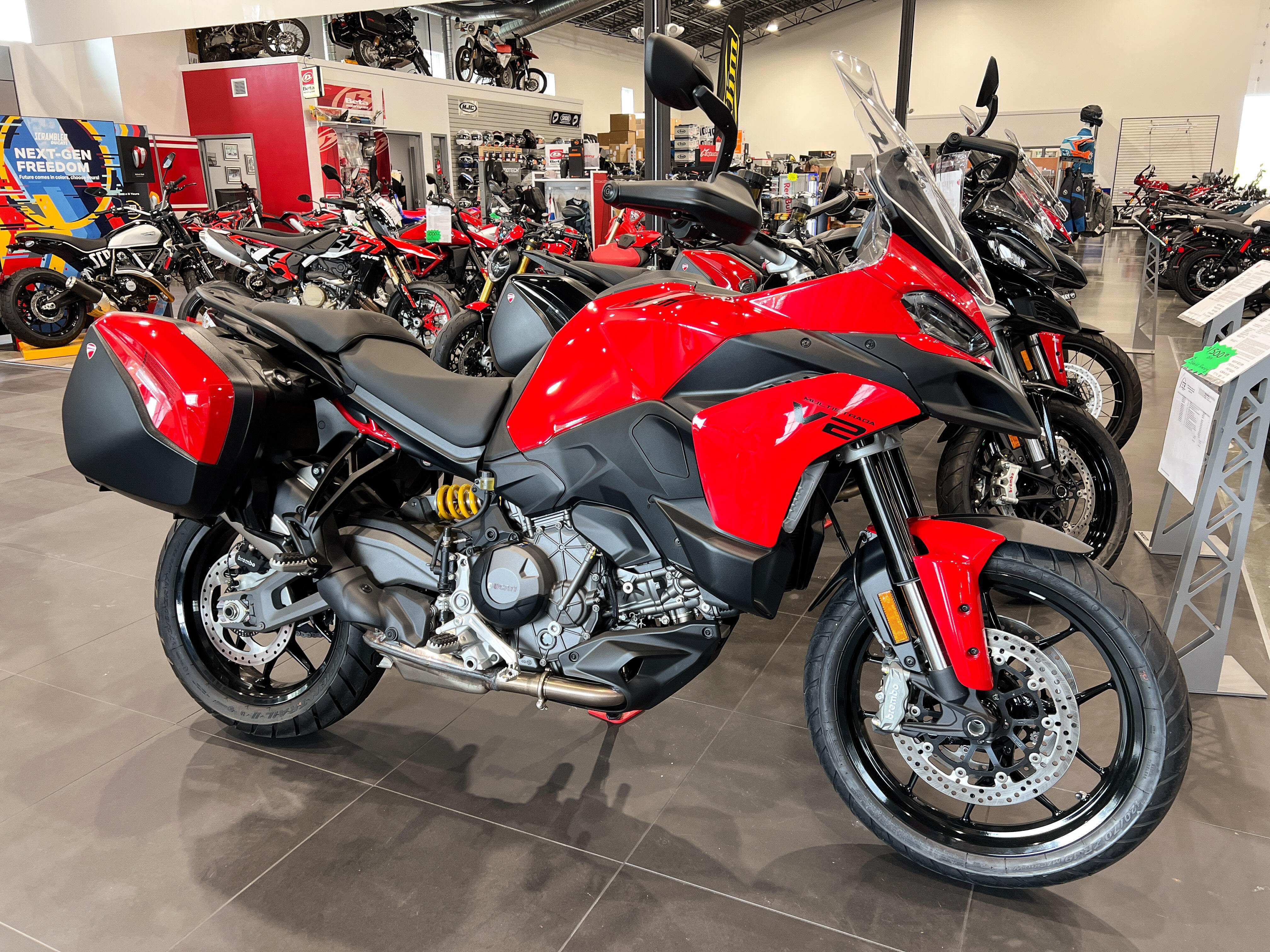 The new Multistrada V2 is a completely new project, conceived to combine performance, touring capability and ease of use. With integrated elements such as the indicators and air deflectors, the bike boasts a clean, functional look. The new aluminum monocoque frame and 19” front wheel transmit agility and lightness, without compromizing on comfort.